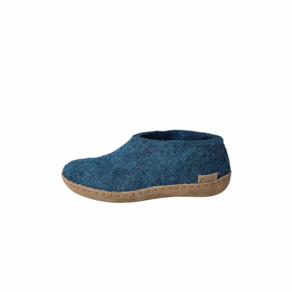 Our junior shoes/slippers are made of 100% pure, natural wool in the classic colour petrol with a sole of soft and chrome-free calfskin. We started making slippers over 30 years ago - in fact, our founder Nanny Glerup made the first pair of slippers as a declaration of love to her husband Ove.