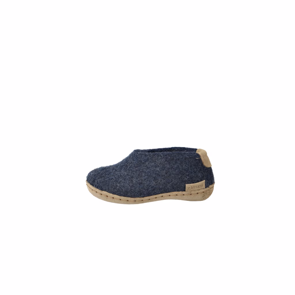 Our kids shoes/slippers are made of 100% pure, natural wool in the classic colour denim with a sole of soft and chrome-free calfskin. We started making slippers over 30 years ago - in fact, our founder Nanny Glerup made the first pair of slippers as a declaration of love to her husband Ove.