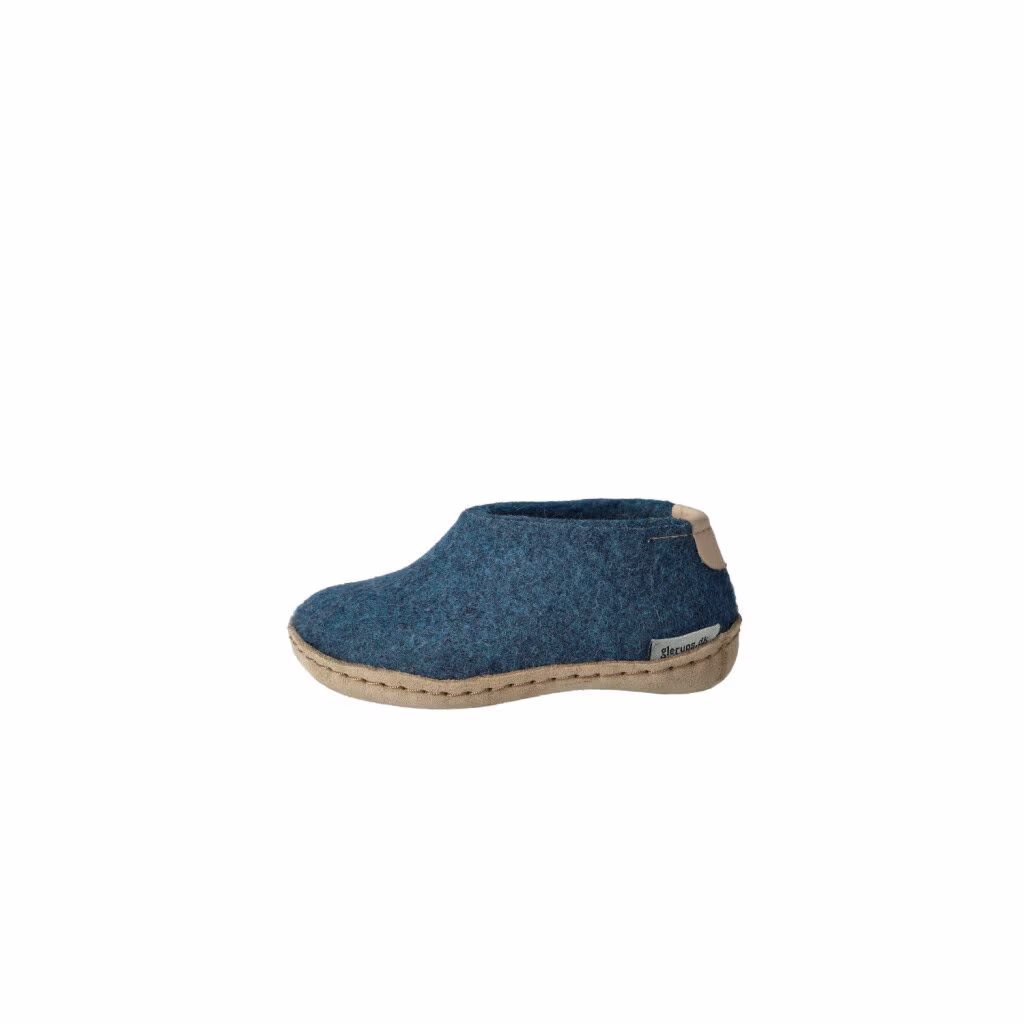 Our kids shoes/slippers are made of 100% pure, natural wool in the classic colour petrol with a sole of soft and chrome-free calfskin. We started making slippers over 30 years ago - in fact, our founder Nanny Glerup made the first pair of slippers as a declaration of love to her husband Ove.